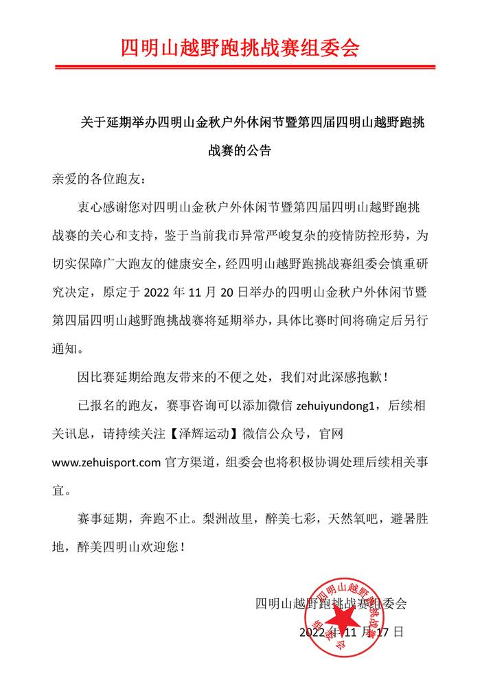 关于延期举办四明山金秋户外休闲节暨第四届四明山越野跑挑战赛的公告